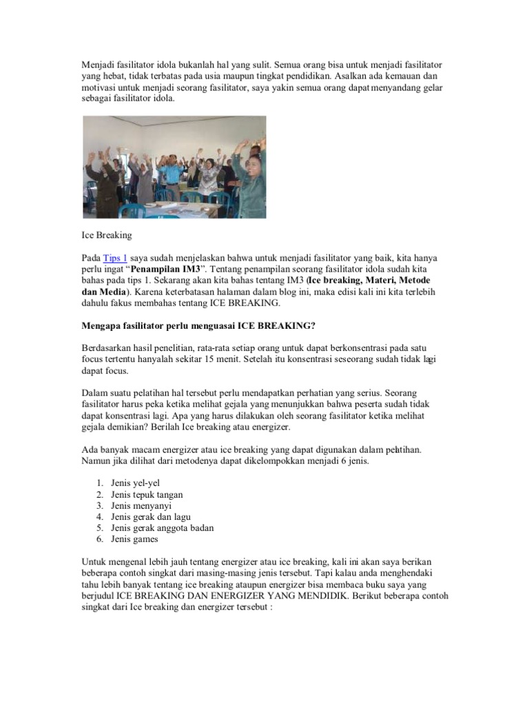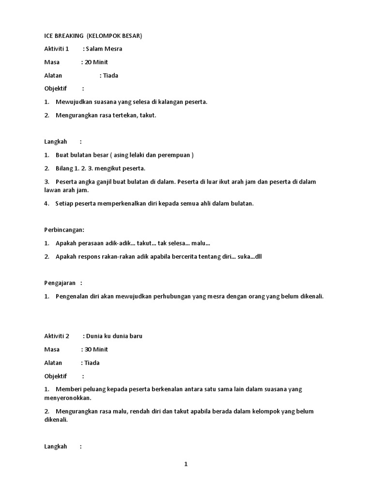 Siapa Saja yang Perlu Di Beri Ice Breaking. Dalam kebanyakan program atau aktiviti kokurikulum aktiviti pemula adalah penting. Mereka datang ke kelas dengan banyak pengalaman hidup beberapa lebih dari yang lain tentunya dan beberapa dari mereka membawa kebijaksanaan juga tergantung pada.
